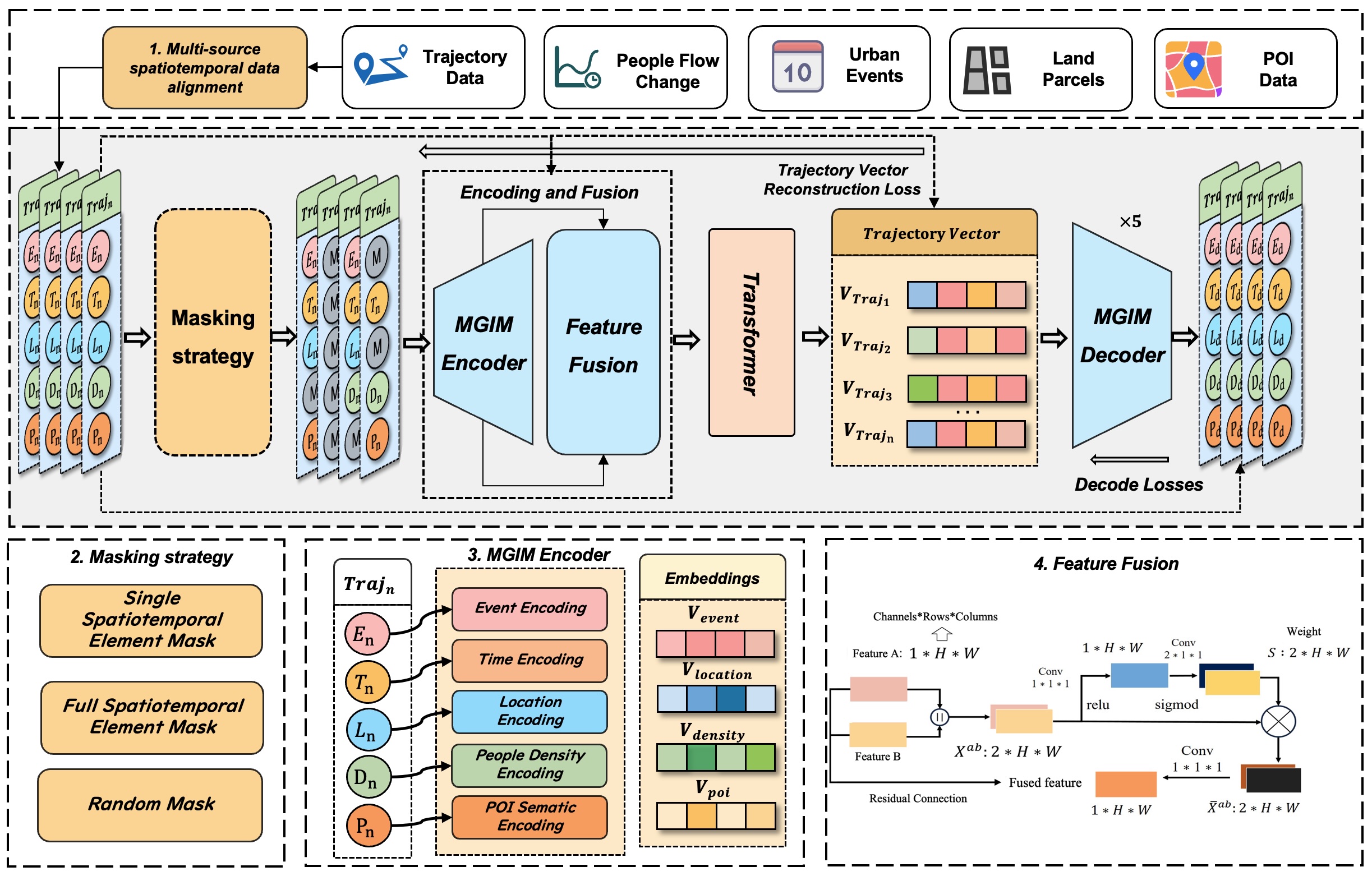 Effective modeling of spatio-temporal contexts to support geographic reasoning is essential for advancing Geospatial Artificial Intelligence. Inspired by masked language models, this paper introduces the Masked Geographical Information Model (MGIM), a novel self-supervised framework for learning context-aware representations from multi-source spatio-temporal data. The framework’s core innovations include a parcel-scale method for multi-source data fusion and a custom self-supervised masking strategy for diverse geographic elements. This integrated modeling approach enables the model to capture complex spatio-temporal relationships and achieve consistently strong performance across diverse geographic reasoning tasks, such as trajectory inference, people flow inference, event identification, and land parcel function analysis. MGIM accurately reasons from spatio-temporal contexts and dynamically adjusts inferences according to contextual changes. The visualization of attention mechanisms further illustrates MGIM’s capacity to construct contextually-aware representations and task-specific attention patterns analogous to natural language processing models. This study presents a new paradigm for general-purpose spatio-temporal modeling in real-world geographic scenarios, offering significant theoretical and practical value, and promising an effective solution for building a geographic foundation model.